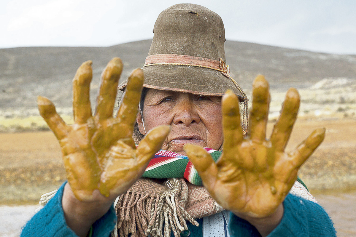Lorencia Manzano muestra la contaminación que afecta al río Titire, ubicado en Puno. Sus manos evidencian una tragedia ambiental.